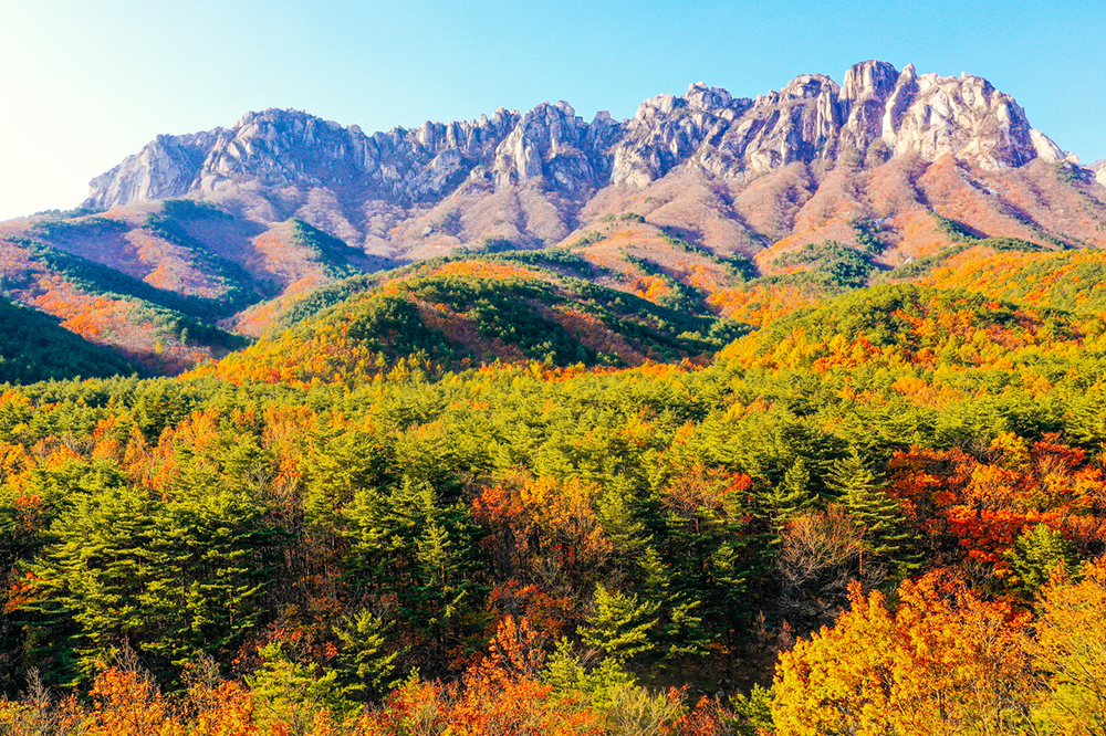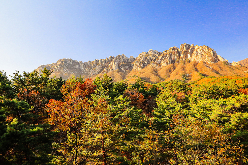 설악산은 가을철 단풍이 특히 아름답기로 유명합니다. 다양한 고도에 분포한 나무들이 각각 다른 시기에 단풍으로 물들기 시작하면서 단풍의 변화 과정이 길게 이어집니다.